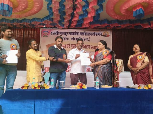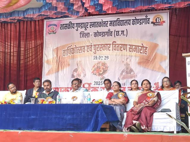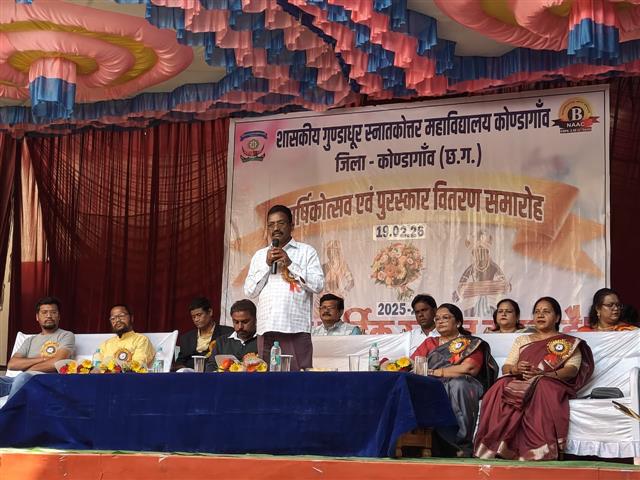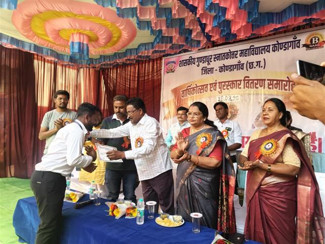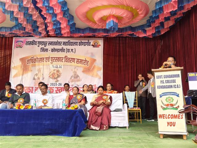 वार्षिकोत्सव एवं पुरस्कार वितरण समारोहशासकीय गुण्डाधुर स्नातकोत्तर महाविद्यालय, कोंडागांव में प्राचार्य डॉ. सरला आत्राम के निर्देशन एवं मार्गदर्शन में वार्षिकोत्सव एवं पुरस्कार वितरण समारोह का आयोजन अत्यंत भव्य, सुव्यवस्थित एवं गरिमामय वातावरण में संपन्न हुआ। समारोह के मुख्य अतिथि नगर पालिका परिषद कोंडागांव के अध्यक्ष श्री नरपति पटेल तथा विशिष्ट अतिथि के रूप में गणमान्य नागरिक श्री कुलवंत चहल एवं ग्राम केरावाही के ग्रामप्रमुख श्री बलिराम नेताम की गरिमामयी उपस्थिति ने आयोजन को विशेष महत्व प्रदान किया।